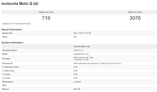 Av att döma på benchmark- programmet så kommer Moto G4 att ha mellanklass- chipet Snapdragon 617, istället för Snapdragon 820 som det tidigare ryktas om. Den ska dessutom få 3 GB RAM istället för 4 GB som de också spekulerats i.