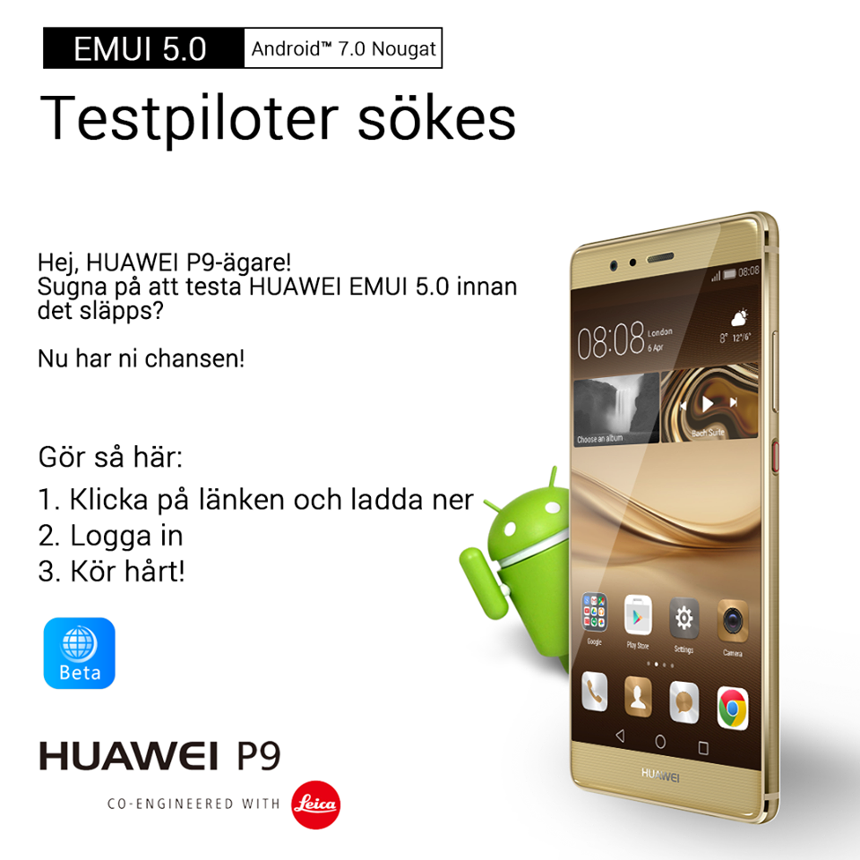 De som har en P9 i sin närhet får gärna betatesta företagets nya gränssnitt EMUI 5.0 tillsammans med Android 7.0 Nougat meddelar Huawei på sin svenska Facebook sida att man släpper samma uppdatering som man gjorde till Honor 8 under gårdagen. Skillnaden är dock att uppdateringen nu släpps i Sverige. Om man vill betatesta programvaran ska man hämta hem denna fil.