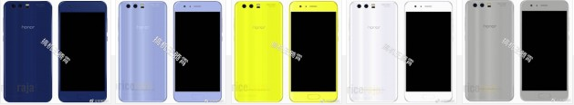 Av bilden nedan att döma kommer Huawei Honor 9 bli tillgänglig i färgerna blått, ljusblått, vitt, grått och gult. Det verkar inte som att Huawei satsar på att släppa en svart variant av telefonen. Av bilden att döma kommer Honor 9 få en fingeravtrycksläsare placerad på framsidan och dubbla kameror på baksidan.