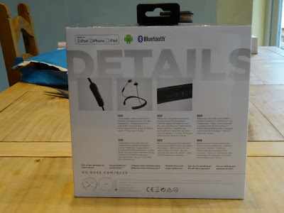 På lådans baksida finner vi viktiga detaljer kring Bose QuietControl 30. Här nämns det bland annat att hörlurarna har tio timmars batteritid på en full laddning och att nack-kragen är designad för att ligga bekvämt runt nacken hela dagen. Precis som Bose QuietComfort 35 fungerar Bose Connect-appen med QuietControl 30. I den här appen ska man kunna se hörlurarnas batteritid men också ställa hur mycket Noice Canceling man vill ha på.
