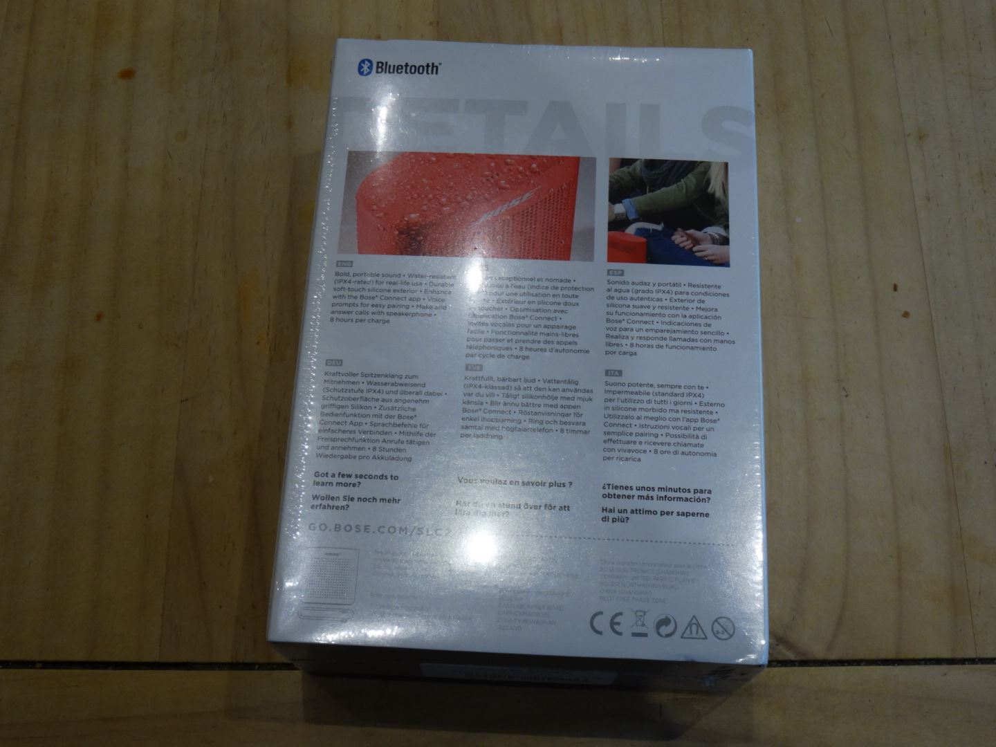fallet är en Soundlink Color II i rött. På framsidan av lådan finner vi också