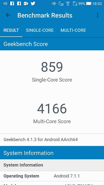 Självklart testade jag att köra ett benchmarktest på mobilen. Den här gången kom turen till Geekbench 4 där jag fick siffran 859 (Single-Core) och 4166 (Multi-Core). Som jag nämnt i tidigare tester visar benchmartkprogrammen bara siffror, och det är tydligt i det här fallet. ASUS Zenfone 4 presterar bättre än vad Geekbench 4 visar.
