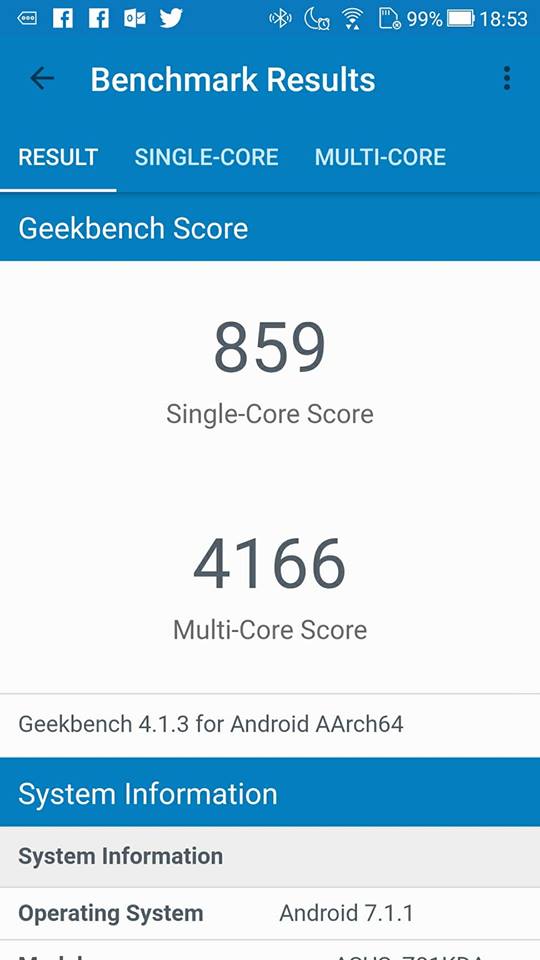 Självklart testade jag att köra ett benchmarktest på mobilen. Den här gången kom turen till Geekbench 4 där jag fick siffran 859 (Single-Core) och 4166 (Multi-Core). Som jag nämnt i tidigare tester visar benchmartkprogrammen bara siffror, och det är tydligt i det här fallet. ASUS Zenfone 4 presterar bättre än vad Geekbench 4 visar.