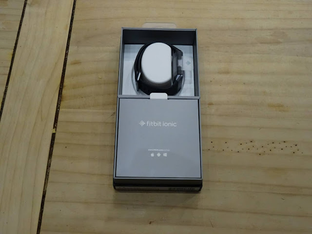 På framsidan av lådan finns det en bild på produkten, i det här fallet en Fitbit Ionic tillsammans med produkttexten Fitbit Ionic. Något som sticker ut från tidigare Fitbit-produkter har lådan till Ionic fått ett svart tema. På baksidan av lådan finns lite bilder på klockan som bland annat visar att Ionic har ett löstagbart armband. På den vänstra långsidan hittar vi vissa huvudspecifikationer där det bland annat nämns att Ionic fått en pulsmätare.