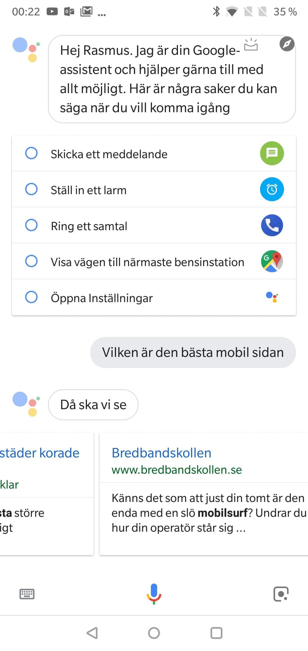 När jag helt plötsligt långtryckte på hemknappen (i det här fallet på en OnePlus 6) så kom skärmen för Google Assistent upp. Det var super enkelt att komma igång och börja ställa massa dumma frågor till Google Assistent.
