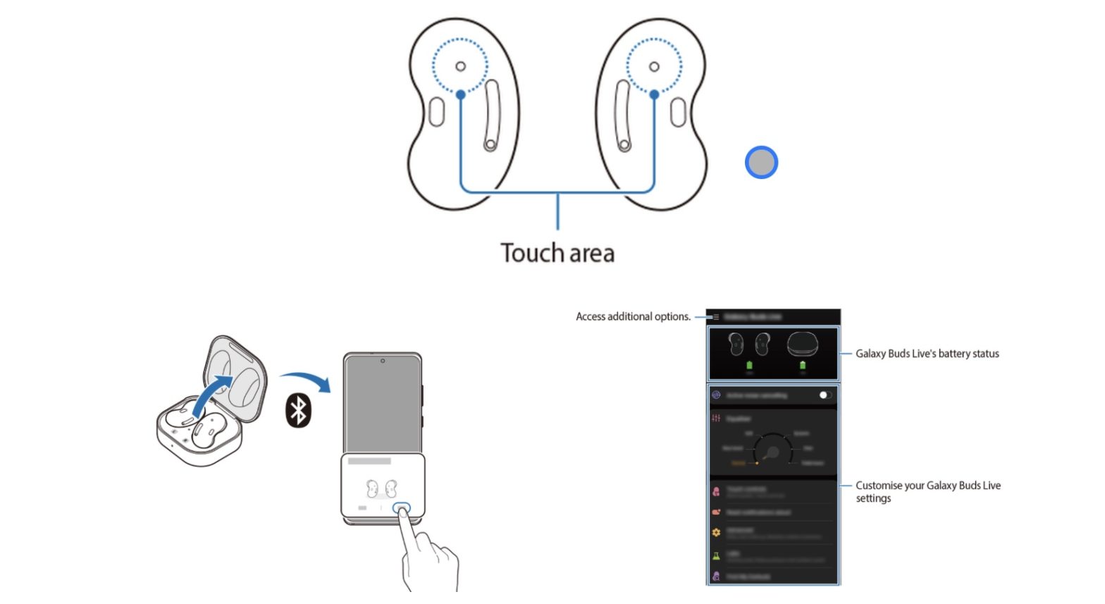Vi ser på bilden ovan att Samsung Galaxy Buds Live kommer kunna styras med svepgester. Utöver det ser vi att det kommer vara möjligt att koppla ihop din smartphone med Buds Live på ett mycket enkelt sätt genom ett tryck. På bilden framkommer det även att det kommer vara enkelt att se hörlurarnas batteri genom appen.